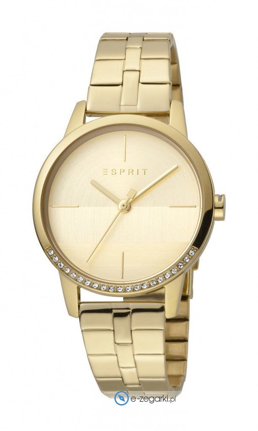 Zegarek damski ES1L106M0075 marki Esprit to dobra pozycja dla ludzi ceniących sobie dbałość o detale a także bezproblemowe działanie mechanizmów. Cyferblat zegarka w kolorze złotym. Koperta w barwach koloru złotego szeroka jest na 34 mm - cechuje się okrągłym kształtem.