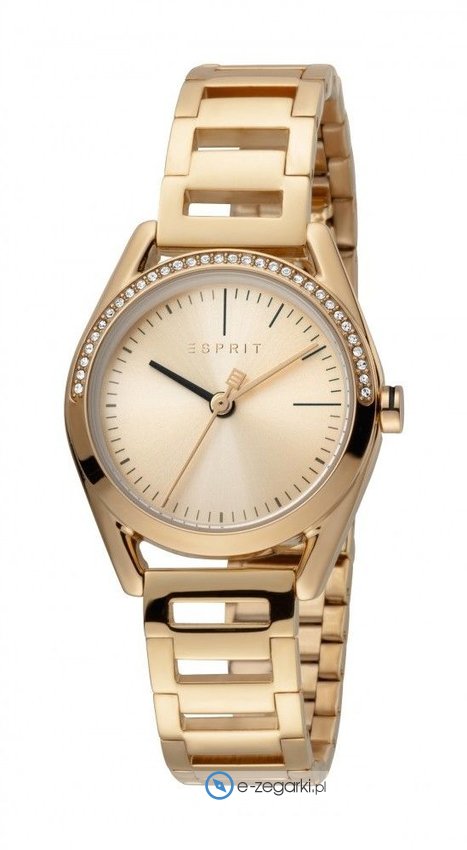 Zegarek damski ES1L117M0075 marki Esprit to ciekawa pozycja dla ludzi ceniących sobie dbałość o detale jak również bezawaryjne zachowanie mechanizmów. Wysokiej trwałości tarczę zegarka ozdobiono złotym kolorem. Aktualna godzina prezentowana jest w sposób analogowy co niezmiernie łatwo pozwala ją odczytać. Koperta jest ozdobiona kolorem złotym - wyróżnia się okrągłym kształtem.