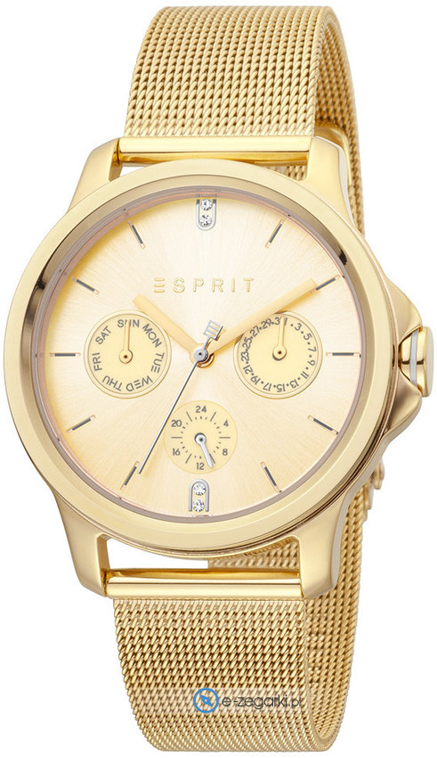 Damski zegarek Esprit ES1L145M0075 to zegarek, który dzięki swemu wzornictwu zawsze będzie prezentował się dobrze. Charakterystyczny wygląd czasomierza osiągnięto m.in. poprzez cyferblat w kolorze szampańskim. Zegarek ten prezentuje aktualny czas w formacie analogowym dzięki czemu odczyt jest intuicyjny. Koperta w odcieniach koloru złotego szeroka jest na 36 mm oraz ma grubość 9 mm - w kształcie okrągłym.