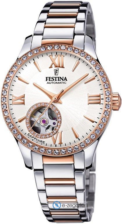 Zegarek damski F20487-1 marki Festina to idealne połączenie funkcjonalności oraz modnego wzornictwa. Model ten zalicza się do serii Festina Automatic. Pokazana metodą analogową bieżąca godzina jest czytelna i szybka do odczytania. Koperta szeroka jest na 33 mm oraz ma grubość 10 mm - posiada okrągły kształt.