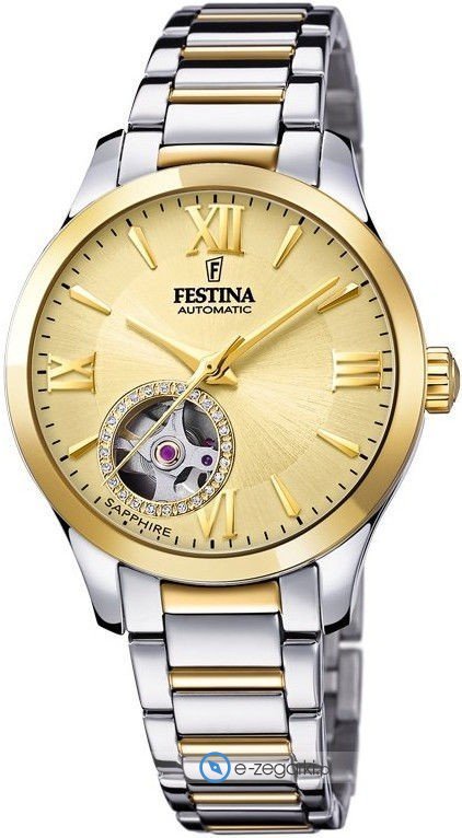 Zegarek F20489-2 marki Festina to gustowny zegarek naręczny damski, który jest wyposażony w pomysłowe rozwiązania i funkcje. Model ten pochodzi z serii Festina Automatic. Stylu dodaje wysokiej klasy cyferblat w kolorze złotym. Zaprezentowana metodą analogową bieżąca godzina jest czytelna i łatwa do odczytania. Koperta szeroka jest na 33 mm oraz ma grubość 10 mm - ma okrągły kształt.