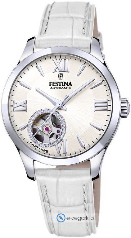 Damski zegarek F20490-1 z kolekcji Festina Automatic marki Festina to połączenie stylu i pomysłowych mechanizmów. Stylu nadaje wysokiej klasy cyferblat w kolorze beżowym. Godzina zaprezentowana jest w sposób analogowy co niezmiernie łatwo pozwala ją odczytać. Koperta szeroka jest na 33 mm oraz ma grubość 10 mm - charakteryzuje się okrągłym kształtem.