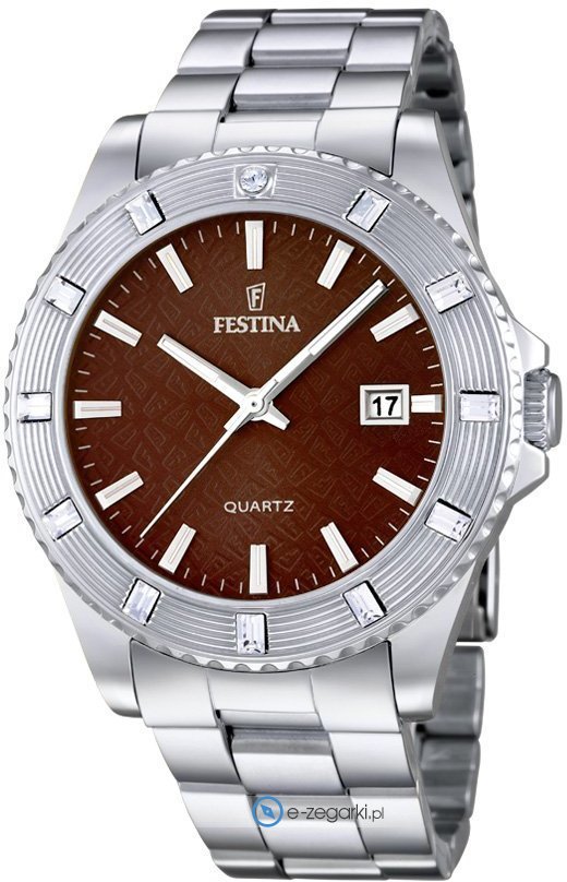 Festina tego brandu raczej nie ma konieczności specjalnie przedstawiać. To znana i doceniana praktycznie na całym świecie marka zajmująca się produkcją czasomierzy, która narodziła się początkiem XX wieku w szwajcarskiej miejscowości La Chaux-de-Fonds. Od momentu gdy marka trafiła do osobnej grupy Festina Group w latach osiemdziesiątych poprzedniego stulecia stała się bardzo zauważalna. Obecnie zegarki Festina można nabyć w ponad pięćdziesięciu krajach na wszystkich kontynentach. Markę Festina bardzo często można zobaczyć na różnego rodzaju imprezach sportowych, np wyścigach kolarskich Tour de France. Wyróżnikiem zgeraków Festina jest posiadanie specjalnego utwardzanego szkiełka mineralnego na które producent udziela osobnej pięcio letniej gwarancji. Obecnie twarzą marki jest słynny i ceniony aktor Gerard Butler, można go ujrzeć w wielu spotach reklamowych właśnie z czasomierzem Festina.