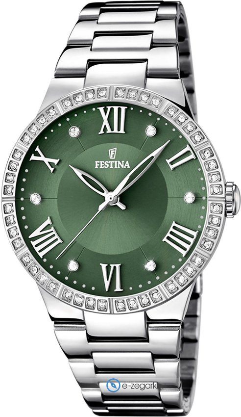 Damski zegarek F16719-5 z serii Festina Boyfriend marki Festina to połączenie stylu oraz oryginalnych funkcji. Cyferblat zegarka jest w kolorze zielonym. Zegarek ten prezentuje godzinę w formacie analogowym dzięki temu odczyt jest intuicyjny. Koperta jest w kolorze srebrnym szeroka jest na 36 mm oraz ma grubość 9 mm - charakteryzuje się okrągłym kształtem.