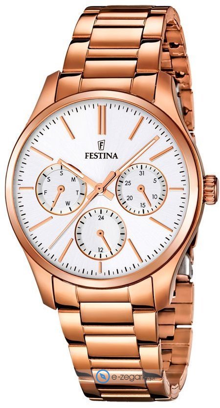 Zegarek F16816-1 marki Festina to elegancki zegarek naręczny damski, który posiada pomysłowe rozwiązania i funkcje. Model ten należy do serii Festina Boyfriend. Charakter zapewnia wysokiej jakości tarcza w kolorze białym. Pokazana metodą analogową bieżąca godzina jest czytelna i szybka do sprawdzenia. Koperta jest w kolorze różowo złotym szeroka jest na 36 mm oraz ma grubość 9 mm - w kształcie okrągłym.