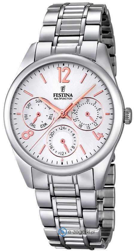 Festina tego brandu zapewne nie ma potrzeby specjalnie prezentować. To znana i uznawana praktycznie na całym świecie marka zajmująca się produkcją czasomierzy, która narodziła się na początku XX wieku w szwajcarskiej miejscowości La Chaux-de-Fonds. Od czasu gdy marka weszła w skład nowej grupy Festina Group w latach 80-tych ubiegłego stulecia stała się bardzo zauważalna. W dzisiejszych czasach zegarki Festina można kupić w ponad pięćdziesięciu krajach na świecie. Markę Festina bardzo często można zobaczyć na różnego przekroju imprezach sportowych, np wyścigach kolarskich Tour de France. Istotną cechą zgeraków Festina jest posiadanie specjalnie utwardzanego szkiełka mineralnego na które marka udziela osobnej pięcio letniej gwarancji. Obecnie twarzą marki jest popularny i ceniony aktor Gerard Butler, można go ujrzeć w wielu reklamach właśnie z chronometrem Festina.