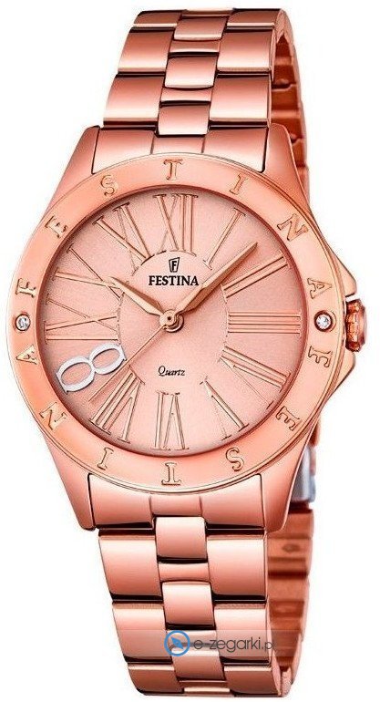 Kwarcowa bateria umieszczona w zegarku F16926-2 zapewnia zasilanie jego mechanizmu. Odporna na korozję oraz działanie czynników atmosferycznych bransoleta w odcieniach koloru różowo złotego zapewnia wysoką jakość i trwałość.