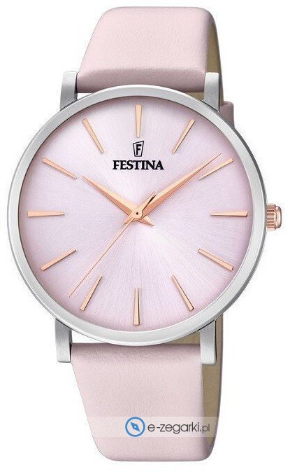 Zegarek damski F20371-2 marki Festina to idealne połączenie funkcjonalności oraz ciekawego wzornictwa. Model ten zalicza się do kolekcji Festina Boyfriend. Niebanalny wygląd zegarka uzyskano m.in. poprzez cyferblat w kolorze różowym. Zaprezentowana metodą analogową aktualna godzina jest czytelna i łatwa do sprawdzenia. Koperta jest w kolorze srebrnym szeroka jest na 38 mm oraz ma grubość 7 mm - w kształcie okrągłym.