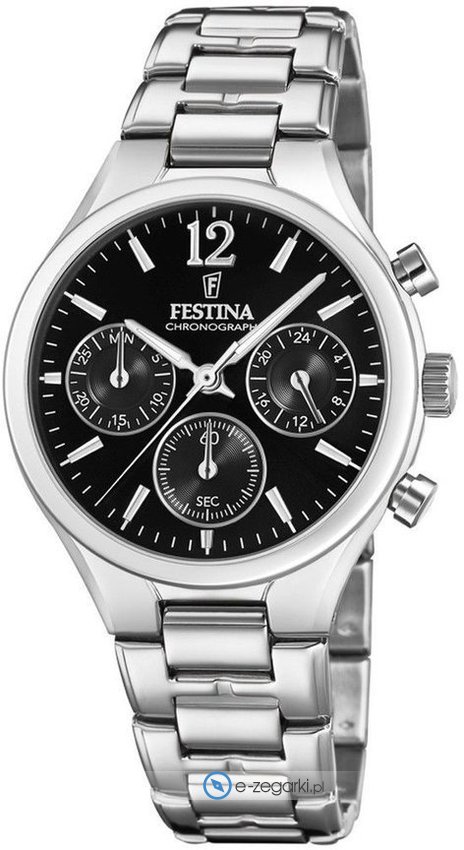 Model damski F20391-4 marki Festina z serii Festina Boyfriend. Stylu nadaje wysokiej jakości tarcza w kolorze czarnym. Aktualna godzina zaprezentowana jest w sposób analogowy co niezmiernie łatwo pozwala ją odczytać. Koperta jest pokryta kolorem srebrnym szeroka jest na 36 mm oraz ma grubość 9 mm - ma okrągły kształt.