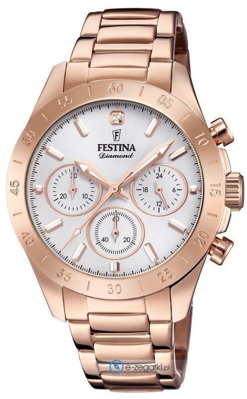 Zegarek damski F20399-1 marki Festina to idealne połączenie funkcjonalności a także ciekawego wzornictwa. Model ten należy do serii Festina Boyfriend. Tarcza zegarka jest w kolorze srebrnym. Aktualna godzina prezentowana jest w sposób analogowy co intuicyjnie pozwala ją odczytać. Koperta jest w kolorze różowo złotym szeroka jest na 39 mm oraz ma grubość 11 mm - cechuje się okrągłym kształtem.