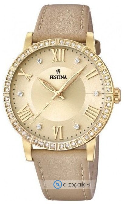 Zegarek damski F20413-1 marki Festina to dobre połączenie funkcjonalności oraz modnego designu. Model ten w gamie innych zegarków tego producenta występuje w serii Festina Boyfriend. Wysokiej jakości tarczę zegarka pokryto złotym kolorem. Zegarek ten pokazuje aktualny czas w formacie analogowym dzięki czemu odczyt jest bezproblemowy. Koperta jest w kolorze złotym szeroka jest na 36 mm oraz ma grubość 8 mm - ma okrągły kształt.
