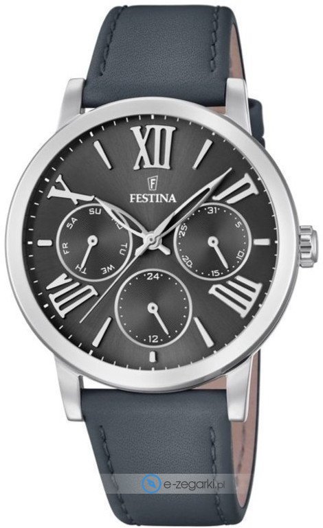 Zegarek damski F20415-4 marki Festina to idealne połączenie funkcjonalności i ciekawego wzornictwa. Model ten w gamie innych zegarków tego producenta występuje w serii Festina Boyfriend. Atrakcyjny wygląd czasomierza uzyskano m.in. poprzez tarczę w kolorze szarym. Pokazana metodą analogową aktualna godzina jest czytelna i prosta do sprawdzenia. Koperta w barwach koloru srebrnego szeroka jest na 36 mm oraz ma grubość 9 mm - w kształcie okrągłym.