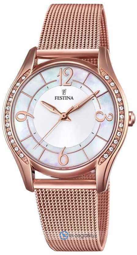 Zegarek F20422-1 zasilany jest za pomocą baterii kwarcowej. Odporna na korozję oraz oddziaływanie czynników atmosferycznych bransoleta różowo złotego koloru zapewnia wysoką jakość i trwałość.