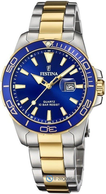 Zegarek F20504-1 marki Festina to gustowny zegarek naręczny damski, który posiada pomysłowe rozwiązania i funkcje. Model ten występuje w serii Festina Boyfriend. Wysokiej trwałości tarczę zegarka ozdobiono granatowym kolorem. Aktualna godzina pokazywana jest w sposób analogowy co intuicyjnie pozwala ją odczytać. Koperta w barwach koloru srebrno złotego szeroka jest na 34 mm - posiada okrągły kształt.
