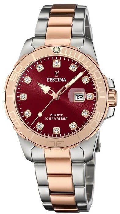 Zegarek F20505-2 marki Festina to stylowy zegarek naręczny damski, który posiada pomysłowe rozwiązania oraz funkcje. Model ten należy do serii Festina Boyfriend. Charakteru dodaje wysokiej jakości tarcza w kolorze czerwonym. Pokazana metodą analogową bieżąca godzina jest czytelna i szybka do odczytania. Koperta została pokryta kolorem różowo złotym szeroka jest na 35 mm oraz ma grubość 9 mm - posiada okrągły kształt.