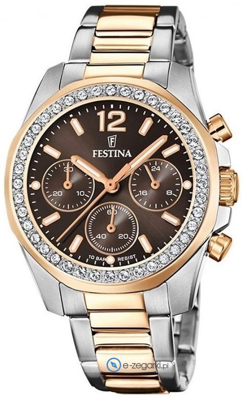Damski zegarek F20608-1 z serii Festina Boyfriend marki Festina to połączenie stylu oraz nieprzeciętnych funkcji. Atrakcyjny wygląd czasomierza uzyskano m.in. poprzez cyferblat w kolorze brązowym. Godzina przedstawiona jest w sposób analogowy co niezmiernie łatwo pozwala ją odczytać. Koperta została pokryta kolorem różowo złotym szeroka jest na 38 mm oraz ma grubość 12 mm - w kształcie okrągłym.
