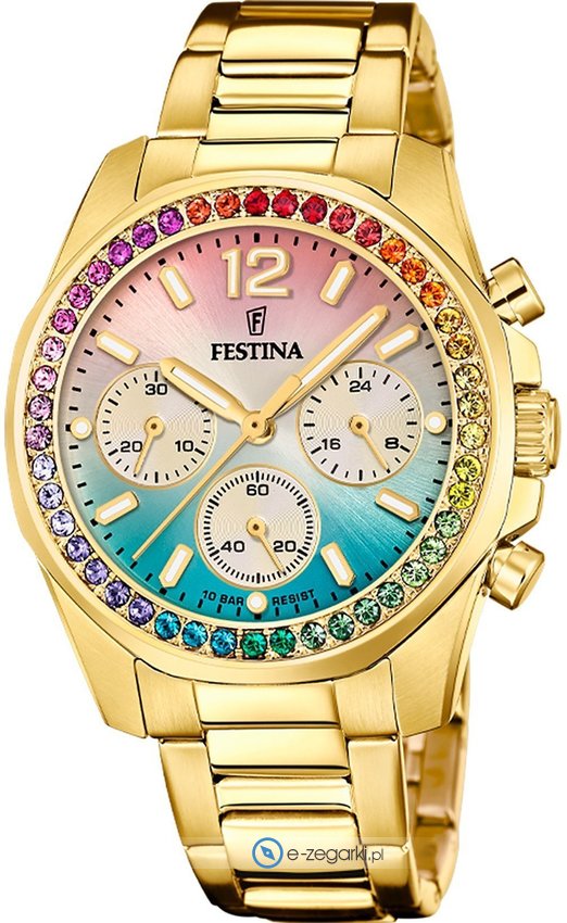 Zegarek damski F20609-5 marki Festina to dobre połączenie funkcjonalności i ciekawego wzornictwa. Model ten należy do serii Festina Boyfriend. Charakteru dodaje wysokiej jakości tarcza w kolorze złotym. Pokazana metodą analogową aktualna godzina jest czytelna i szybka do odczytania. Koperta szeroka jest na 38 mm - ma okrągły kształt.