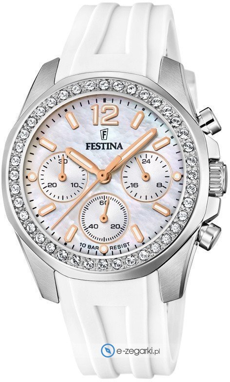 Festina tej marki zapewne nie ma konieczności specjalnie prezentować. To lubiana i doceniana praktycznie na całym świecie marka zajmująca się produkcją zegarków, która narodziła się początkiem XX wieku w Szwajcarii. Od czasu kiedy marka weszła w skład nowej grupy Festina Group w latach osiemdziesiątych poprzedniego stulecia stała się bardzo zauważalna. Obecnie zegarki Festina można kupić w przeszło 50 krajach na świecie. Markę Festina bardzo często można dostrzec na różnego przekroju imprezach sportowych, np wyścigach kolarskich Tour de France. Istotną cechą zgeraków Festina jest posiadanie specjalnego utwardzanego szkiełka mineralnego na które Festina udziela osobnej pięcio letniej gwarancji. Współcześnie twarzą marki jest słynny i szanowany aktor Gerard Butler, można go zauważyć w wielu spotach reklamowych właśnie z zegarkiem Festina.
