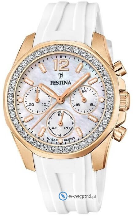 Festina F20611-1 to damski zegarek kierowany dla osób szukających zegarka z serii Festina Boyfriend. Cyferblat zegarka jest w kolorze białym. Aktualna godzina prezentowana jest w sposób analogowy co bez trudu pozwala ją odczytać. Koperta w odcieniach koloru różowo złotego szeroka jest na 38 mm oraz ma grubość 12 mm - wyróżnia się okrągłym kształtem.