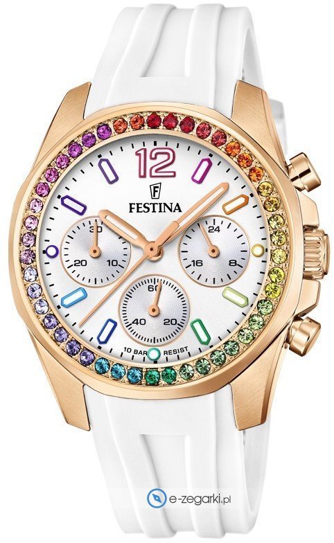 Zegarek F20611-2 marki Festina to stylowy zegarek naręczny damski, który jest wyposażony w ciekawe rozwiązania oraz funkcje. Model ten zalicza się do kolekcji Festina Boyfriend. Ciekawą budowę czasomierza uzyskano dzięki tarczy w kolorze srebrnym. Zaprezentowana metodą analogową bieżąca godzina jest czytelna i prosta do sprawdzenia. Koperta została ozdobiona kolorem różowo złotym szeroka jest na 38 mm oraz ma grubość 12 mm - w kształcie okrągłym.
