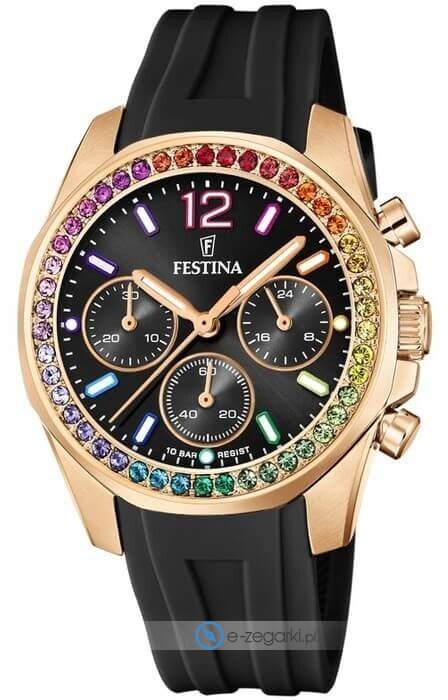 Damski zegarek F20611-3 z kolekcji Festina Boyfriend marki Festina to połączenie estetyki oraz ciekawych mechanizmów. Cyferblat zegarka jest w kolorze czarnym. Godzina pokazywana jest w sposób analogowy co bez trudu pozwala ją odczytać. Koperta jest w kolorze różowo złotym szeroka jest na 38 mm oraz ma grubość 12 mm - w kształcie okrągłym.