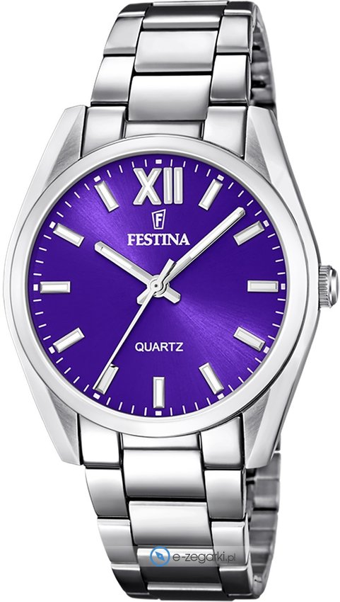 Zegarek damski F20622-A marki Festina to idealne połączenie funkcjonalności a także ciekawego wzornictwa. Model ten w gamie pozostałych zegarków tego producenta występuje w kolekcji Festina Boyfriend. Atrakcyjną konstrukcję czasomierza osiągnięto dzięki tarczy w kolorze fioletowym. Zegarek ten prezentuje aktualny czas w formacie analogowym dzięki temu odczyt jest bardzo łatwy. Koperta jest w kolorze srebrnym szeroka jest na 37 mm oraz ma grubość 9 mm - cechuje się okrągłym kształtem.