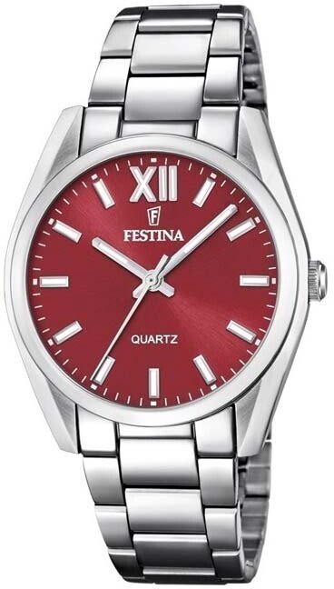 Zegarek damski F20622-B marki Festina to dobre połączenie funkcjonalności oraz modnego designu. Model ten w gamie pozostałych zegarków tego producenta występuje w serii Festina Boyfriend. Atrakcyjny wygląd zegarka uzyskano również dzięki tarczy w kolorze czerwonym. Pokazana metodą analogową aktualna godzina jest czytelna i szybka do odczytania. Koperta została pokryta kolorem srebrnym szeroka jest na 37 mm oraz ma grubość 9 mm - wyróżnia się okrągłym kształtem.