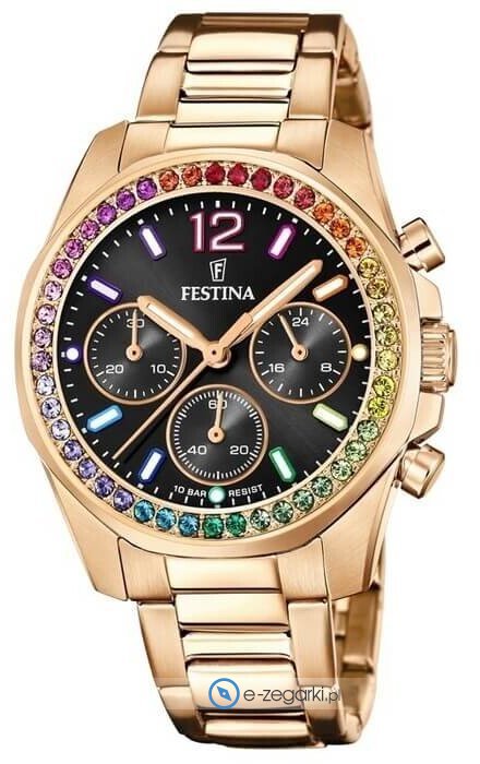 Zegarek F20639-3 marki Festina to stylowy zegarek naręczny damski, który posiada ciekawe rozwiązania i funkcje. Model ten występuje w serii Festina Boyfriend. Charakterystyczny wygląd zegarka osiągnięto również dzięki tarczy w kolorze czarnym. Zaprezentowana metodą analogową bieżąca godzina jest czytelna i łatwa do odczytania. Koperta w odcieniach koloru różowo złotego szeroka jest na 38 mm - posiada okrągły kształt.