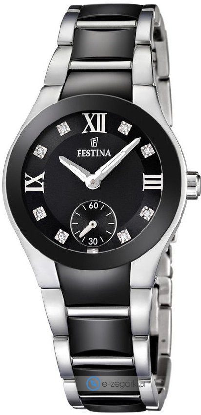 Zegarek damski F16588-3 zalicza się do kolekcji Festina Ceramic marki Festina. Ciekawą konstrukcję zegarka uzyskano dzięki tarczy w kolorze czarnym. Zaprezentowana metodą analogową bieżąca godzina jest czytelna i szybka do sprawdzenia. Koperta szeroka jest na 32 mm - posiada okrągły kształt.