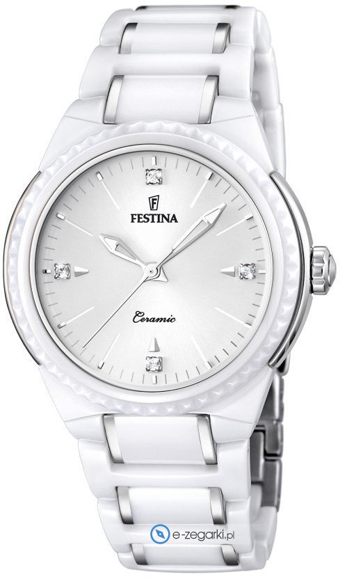 Zegarek damski F16698-1 marki Festina należy do kolekcji Festina Ceramic. Wysokiej jakości cyferblat zegarka pokryto białym kolorem. Zegarek ten pokazuje aktualny czas w formacie analogowym dzięki temu odczyt jest intuicyjny. Koperta szeroka jest na 36 mm oraz ma grubość 11 mm - charakteryzuje się okrągłym kształtem.