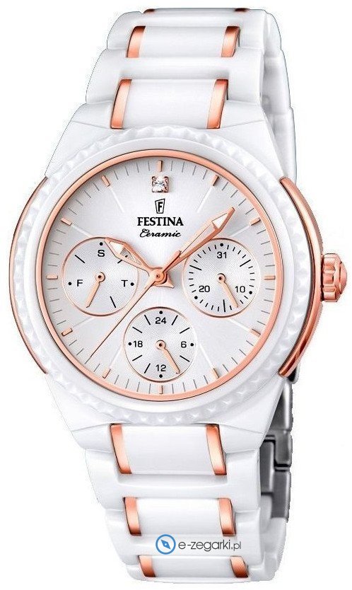 Zegarek damski F16699-5 marki Festina to stylowe połączenie funkcjonalności i ciekawego wzornictwa. Model ten w gamie innych zegarków tego producenta występuje w serii Festina Ceramic. Tarcza zegarka jest w kolorze białym. Zaprezentowana metodą analogową bieżąca godzina jest czytelna i prosta do odczytania. Koperta szeroka jest na 36 mm oraz ma grubość 11 mm - w kształcie okrągłym.
