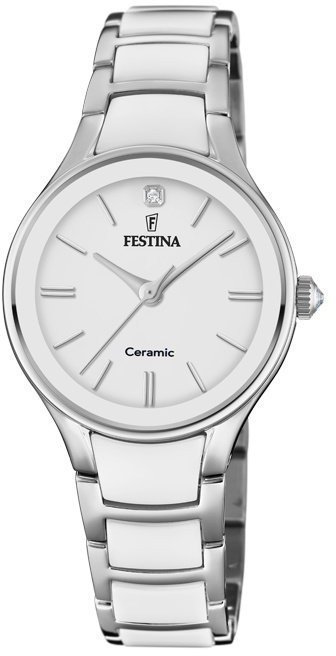 Zegarek damski F20474-1 z serii Festina Ceramic marki Festina. Niebanalny wygląd czasomierza uzyskano również dzięki tarczy w kolorze białym. Godzina prezentowana jest w sposób analogowy co bez trudu pozwala ją odczytać. Koperta szeroka jest na 30 mm oraz ma grubość 8 mm - charakteryzuje się okrągłym kształtem.