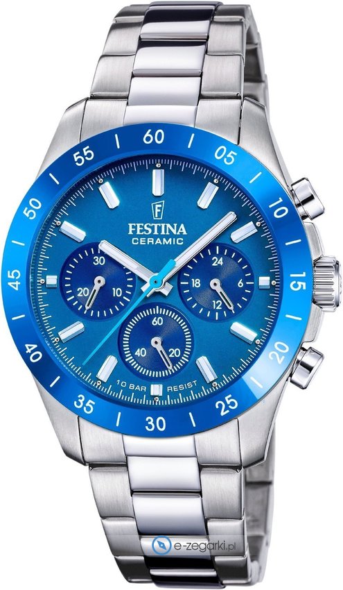Zegarek damski F20693-4 marki Festina to stylowe połączenie funkcjonalności oraz modnego designu. Model ten występuje w kolekcji Festina Ceramic. Styl zapewnia wysokiej klasy cyferblat w kolorze niebieskim. Aktualna godzina zaprezentowana jest w sposób analogowy co intuicyjnie pozwala ją odczytać. Koperta jest w kolorze srebrnym szeroka jest na 39 mm oraz ma grubość 12 mm - ma okrągły kształt.