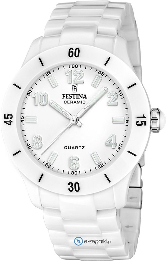 Damski zegarek F20720-1 z serii Festina Ceramic marki Festina to połączenie stylu i nowatorskich funkcji. Atrakcyjny wygląd czasomierza osiągnięto także dzięki tarczy w kolorze białym. Godzina prezentowana jest w sposób analogowy co intuicyjnie pozwala ją odczytać. Koperta jest w kolorze białym szeroka jest na 38 mm - ma okrągły kształt.