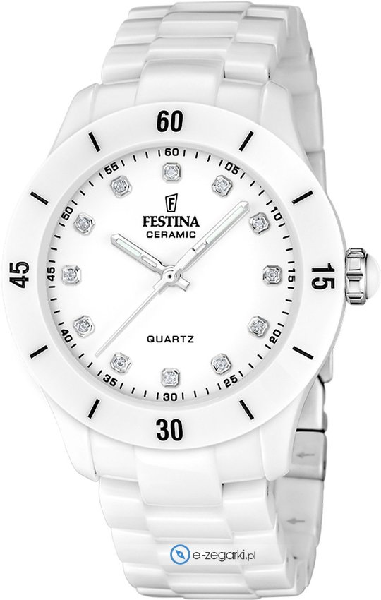 Zegarek damski F20720-2 marki Festina to idealne połączenie funkcjonalności oraz ciekawego wzornictwa. Model ten należy do serii Festina Ceramic. Stylu nadaje wysokiej klasy cyferblat w kolorze białym. Godzina pokazywana jest w sposób analogowy co niezmiernie łatwo pozwala ją odczytać. Koperta w barwach koloru białego szeroka jest na 38 mm - w kształcie okrągłym.
