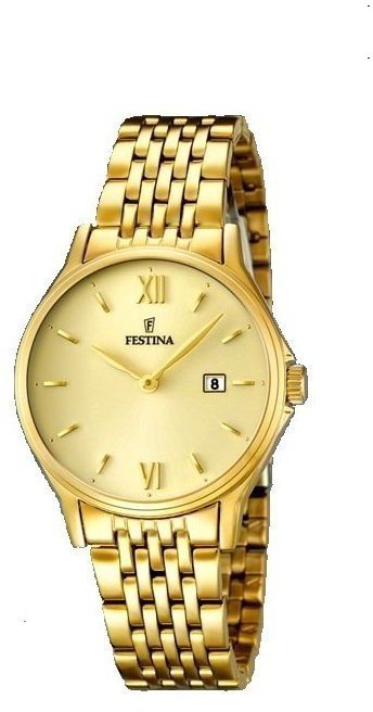Model damski F16749-3 zalicza się do kolekcji Festina Classic Bracelet marki Festina. Charakter zapewnia wysokiej klasy tarcza w kolorze złotym. Pokazana metodą analogową aktualna godzina jest czytelna i łatwa do sprawdzenia. Koperta jest w kolorze złotym szeroka jest na 31 mm oraz ma grubość 7 mm - w kształcie okrągłym.