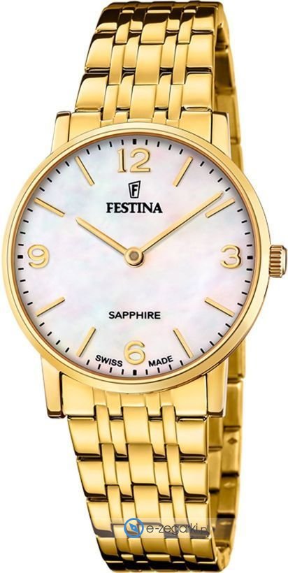 Zegarek damski F20048-2 z serii Festina Classic Bracelet marki Festina. Stylu nadaje wysokiej klasy tarcza w kolorze perłowym. Godzina przedstawiona jest w sposób analogowy co bez trudu pozwala ją odczytać. Koperta jest pokryta kolorem złotym szeroka jest na 29 mm oraz ma grubość 6 mm - wyróżnia się okrągłym kształtem.