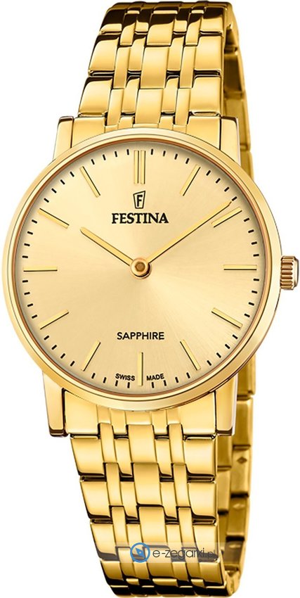 Zegarek F20048-3 marki Festina to elegancki zegarek naręczny damski, który posiada ciekawe rozwiązania i funkcje. Model ten należy do serii Festina Classic Bracelet. Charakteru dodaje wysokiej jakości cyferblat w kolorze złotym. Zegarek ten pokazuje godzinę w formacie analogowym dzięki czemu odczyt jest bardzo łatwy. Koperta jest ozdobiona kolorem złotym szeroka jest na 29 mm oraz ma grubość 6 mm - wyróżnia się okrągłym kształtem.