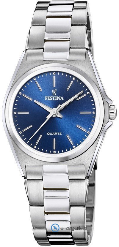 Zegarek damski F20553-3 marki Festina to stylowe połączenie funkcjonalności i ciekawego designu. Model ten w gamie pozostałych zegarków tego producenta występuje w kolekcji Festina Classic Bracelet. Wysokiej trwałości cyferblat zegarka ozdobiono niebieskim kolorem. Pokazana metodą analogową aktualna godzina jest czytelna i szybka do odczytania. Koperta została ozdobiona kolorem srebrnym szeroka jest na 31 mm oraz ma grubość 8 mm - wyróżnia się okrągłym kształtem.