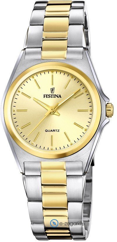 Zegarek damski F20556-3 marki Festina to idealne połączenie funkcjonalności i modnego wzornictwa. Model ten należy do kolekcji Festina Classic Bracelet. Nieschematyczny wygląd czasomierza osiągnięto również dzięki tarczy w kolorze złotym. Pokazana metodą analogową bieżąca godzina jest czytelna i prosta do odczytania. Koperta w odcieniach koloru srebrnego szeroka jest na 31 mm oraz ma grubość 8 mm - ma okrągły kształt.