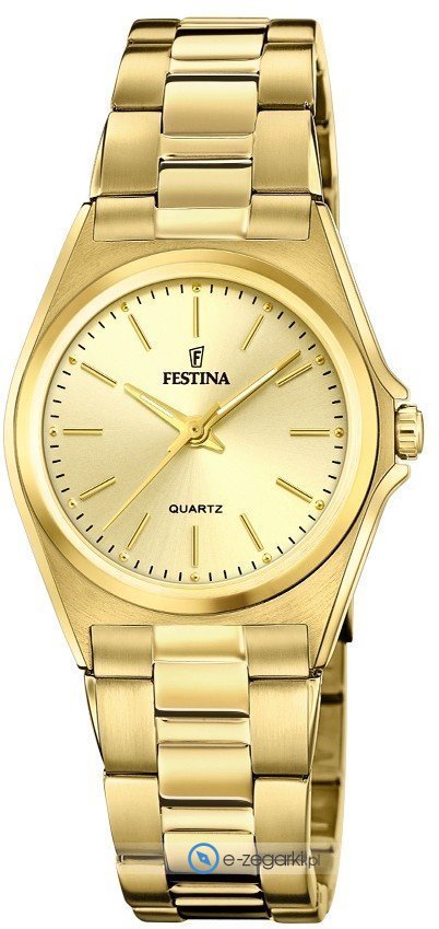 Zegarek F20557-3 marki Festina to gustowny zegarek naręczny damski, który jest wyposażony w ciekawe rozwiązania i funkcje. Model ten występuje w kolekcji Festina Classic Bracelet. Nieschematyczny wygląd zegarka osiągnięto także dzięki tarczy w kolorze złotym. Aktualna godzina przedstawiona jest w sposób analogowy co intuicyjnie pozwala ją odczytać. Koperta jest pokryta kolorem złotym szeroka jest na 31 mm oraz ma grubość 8 mm - posiada okrągły kształt.