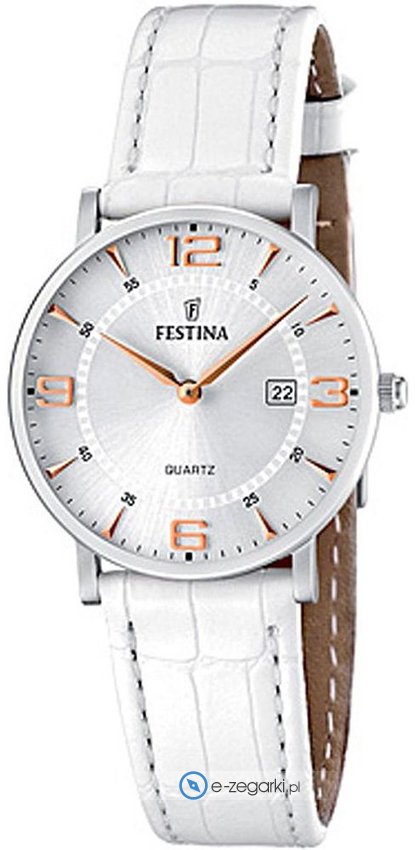 Zegarek F16477-4 zasilany jest za pomocą baterii kwarcowej. Pasek białego koloru zrobiony jest z wysokiej jakości skóry gwarantującej trwałość i komfort noszenia.