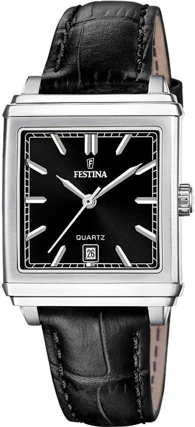 Model damski F20682-6 marki Festina z kolekcji Festina Classic Strap. Wysokiej trwałości cyferblat zegarka pokryto czarnym kolorem. Zaprezentowana metodą analogową aktualna godzina jest czytelna i łatwa do odczytania. Koperta jest w kolorze srebrnym szeroka jest na 27 mm oraz ma grubość 8 mm.