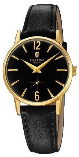 Zegarek damski F20255-3 należy do rodziny Festina Extra marki Festina. Niestereotypowy wygląd zegarka osiągnięto również dzięki tarczy w kolorze czarnym. Zegarek ten pokazuje aktualny czas w formacie analogowym dzięki temu odczyt jest intuicyjny. Koperta jest pokryta kolorem złotym szeroka jest na 29 mm oraz ma grubość 10 mm - charakteryzuje się okrągłym kształtem.