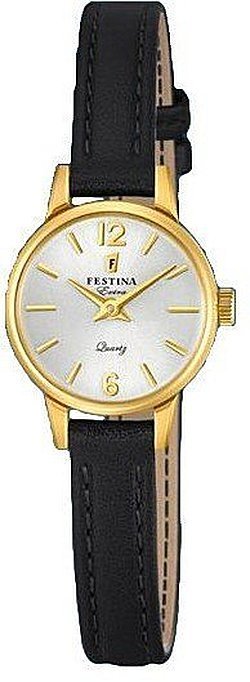 Zegarek F20261-1 marki Festina to gustowny zegarek naręczny damski, który wyposażono w ciekawe rozwiązania i funkcje. Model ten jest z serii Festina Extra. Tarcza zegarka jest w kolorze srebrnym. Aktualna godzina pokazywana jest w sposób analogowy co niezmiernie łatwo pozwala ją odczytać. Koperta w barwach koloru złotego szeroka jest na 20 mm oraz ma grubość 8 mm - wyróżnia się okrągłym kształtem.