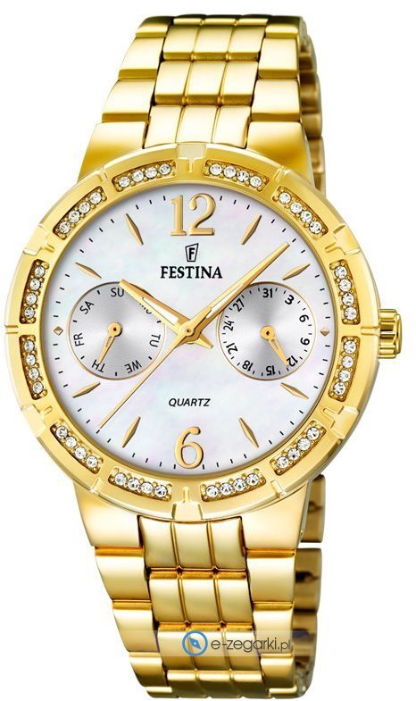 Zegarek F16701-1 marki Festina to elegancki zegarek naręczny damski, który posiada ciekawe rozwiązania i funkcje. Model ten należy do serii Festina Mademoiselle. Niestereotypowy wygląd czasomierza uzyskano m.in. poprzez tarczę w kolorze perłowym. Zegarek ten prezentuje godzinę w formacie analogowym dzięki temu odczyt jest bezproblemowy. Koperta jest ozdobiona kolorem złotym szeroka jest na 36 mm oraz ma grubość 9 mm - charakteryzuje się okrągłym kształtem.