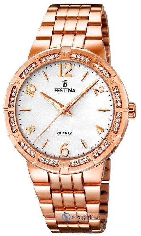 Damski zegarek F16705-1 z kolekcji Festina Mademoiselle marki Festina to połączenie estetyki i ciekawych mechanizmów. Wysokiej jakości tarczę zegarka ozdobiono srebrnym kolorem. Zegarek ten pokazuje aktualny czas w formacie analogowym dzięki temu odczyt jest intuicyjny. Koperta w barwach koloru złotego szeroka jest na 35 mm oraz ma grubość 9 mm - w kształcie okrągłym.