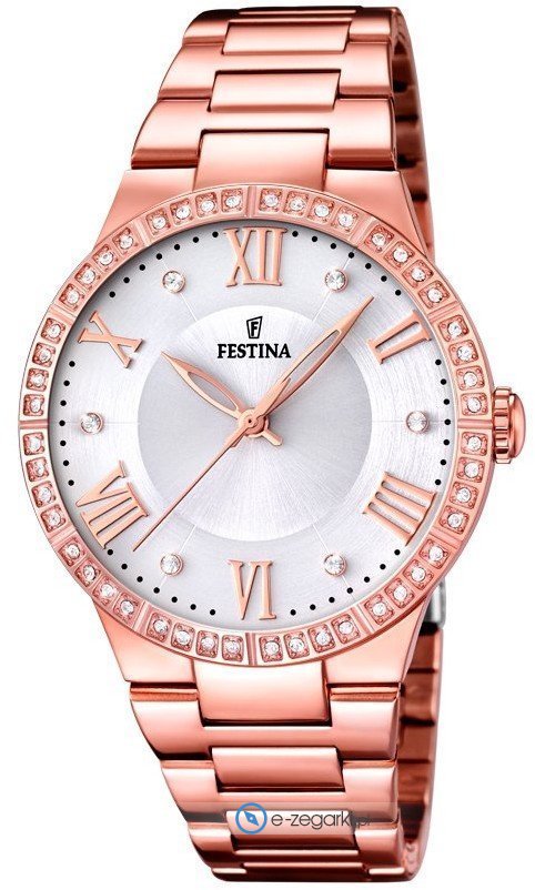 Festina F16721-1 - damski zegarek przeznaczony dla osób szukających zegarka z serii Festina Mademoiselle. Styl zapewnia wysokiej klasy tarcza w kolorze perłowym. Zaprezentowana metodą analogową aktualna godzina jest czytelna i łatwa do sprawdzenia. Koperta jest ozdobiona kolorem różowo złotym szeroka jest na 37 mm oraz ma grubość 8 mm - posiada okrągły kształt.