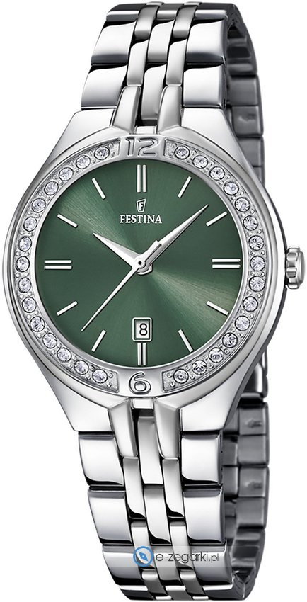 Zegarek damski F16867-7 marki Festina to dobre połączenie funkcjonalności oraz ciekawego designu. Model ten występuje w kolekcji Festina Mademoiselle. Nieschematyczny wygląd zegarka uzyskano m.in. poprzez tarczę w kolorze zielonym. Godzina przedstawiona jest w sposób analogowy co niezmiernie łatwo pozwala ją odczytać. Koperta została pokryta kolorem srebrnym szeroka jest na 32 mm oraz ma grubość 9 mm - posiada okrągły kształt.