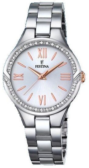 Festina F16916-1 to damski zegarek przeznaczony dla osób szukających zegarka z kolekcji Festina Mademoiselle. Atrakcyjną stylistykę zegarka osiągnięto dzięki tarczy w kolorze perłowym. Aktualna godzina pokazywana jest w sposób analogowy co intuicyjnie pozwala ją odczytać. Koperta w barwach koloru srebrnego szeroka jest na 32 mm oraz ma grubość 9 mm - charakteryzuje się okrągłym kształtem.